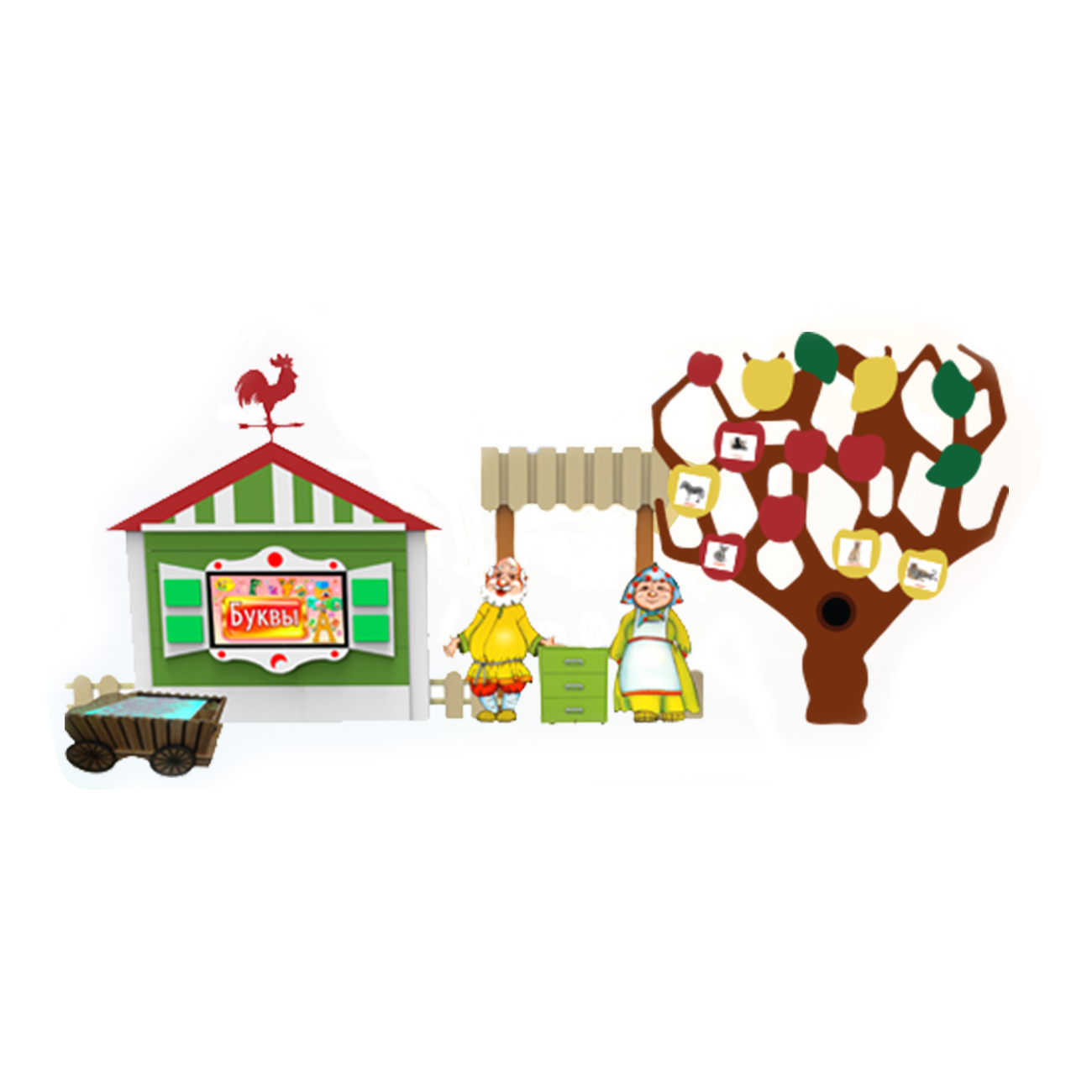 • декоративный пристенный модуль «Дерево» и декоративный настенный элемент «Заборчик с воротами» дополняют стилизованное оформление комплекса