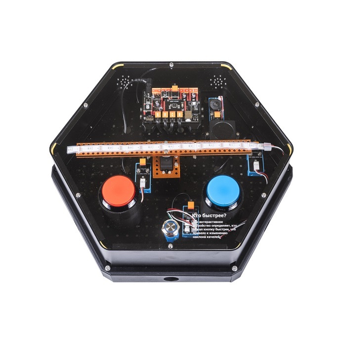 Интерактивный модуль для оформления зон рекреации, кабинетов, IT-полигона, библиотеки, медиа зоны. Модуль позволяет управлять соревновательной игрой, манипулировать с помощью кнопок. Выполнен в форме шестиугольной призмы с интерактивным наполнением.