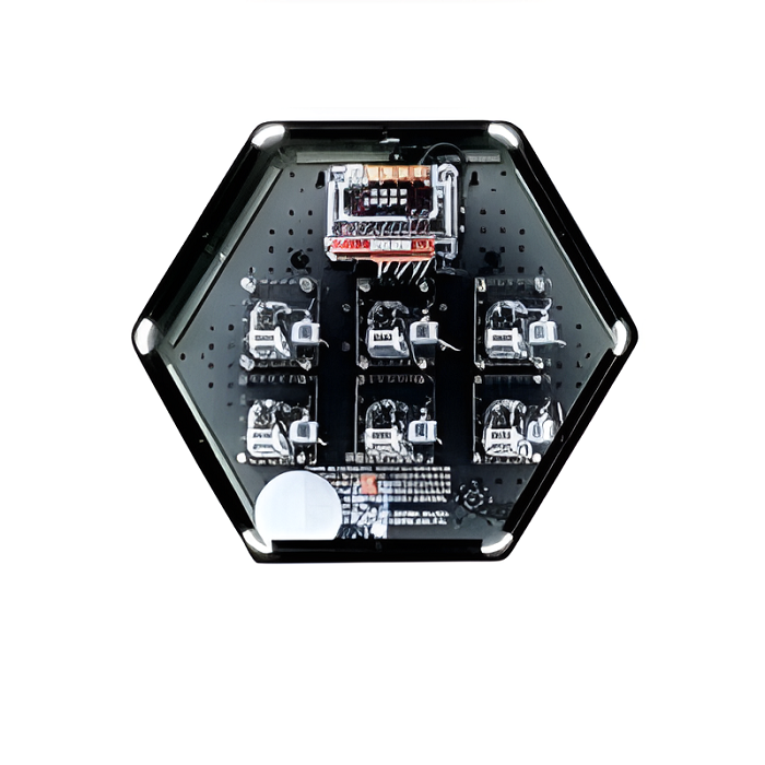 Интерактивный модуль для оформления зон рекреации, кабинетов, IT-полигона, библиотеки, медиа зоны. Модуль позволяет изучить принципы и технологии включающие такие аспекты, как распознавание речи, синтез музыки. Модуль выполнен в форме шестиугольной призмы с интерактивным наполнением.