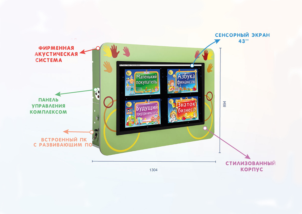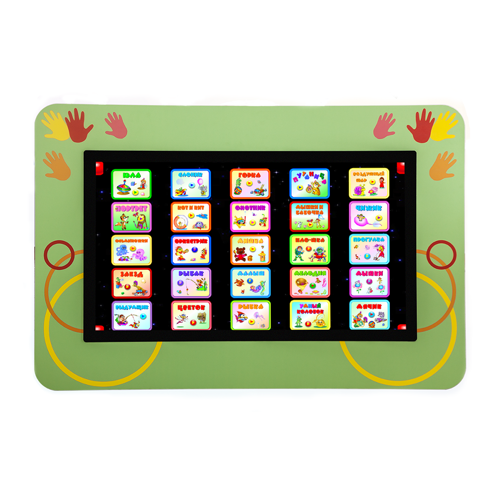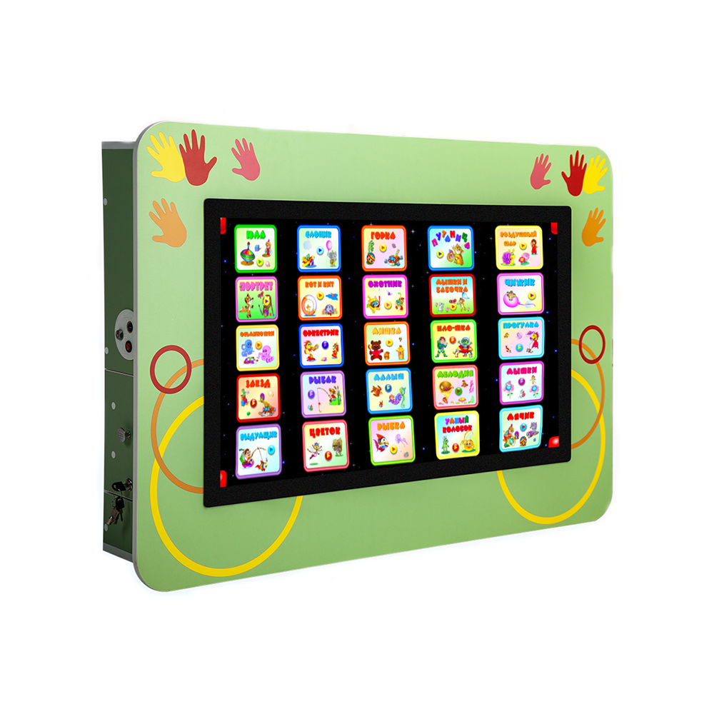 Настенная сенсорная панель «Ладушки» выполнена в лаконичном дизайне для размещения в групповых комнатах детских садов, рекреациях, начальных школах и детских комнатах ресторанов и ТРЦ.