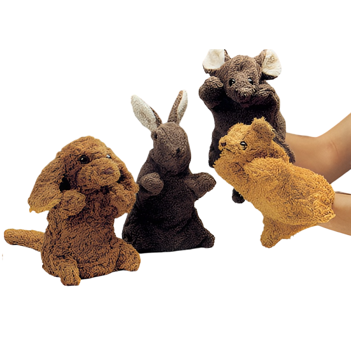 Комплект состоит из кукол, изображающих животных: медведя, зайца, собаки и мышки, надеваемых на руку. Куклы выполнены из махровой ткани, приятны и удобны в использовании. Работа с куклами способствует развитию устной речи, вербальной памяти, творческих способностей, артистичности.
