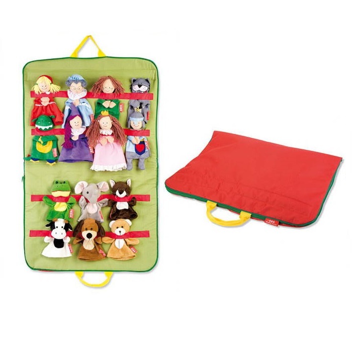 В наборе 14 мягких, красочных, сказочных кукол, упакованных в удобную сумку с резинками и ручками. Ручки для удобства переноски и подвески сумки, а резинки удерживают каждую куклу в нужном месте и препятствуют их движению при работе.