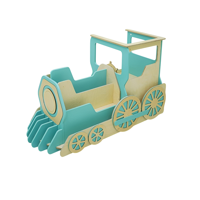 Локомотив поезда – деревянный паровоз с вращающимся рулём и колёсами. Малышам очень нравится залезать внутрь и представлять себя бравым машинистом! Сидушка имеет откидную конструкцию, под ней небольшой отсек для хранения игрушек. Нос паровоза имеет полки-витрины для расстановки книг, раскрасок и коробок с пазлами.