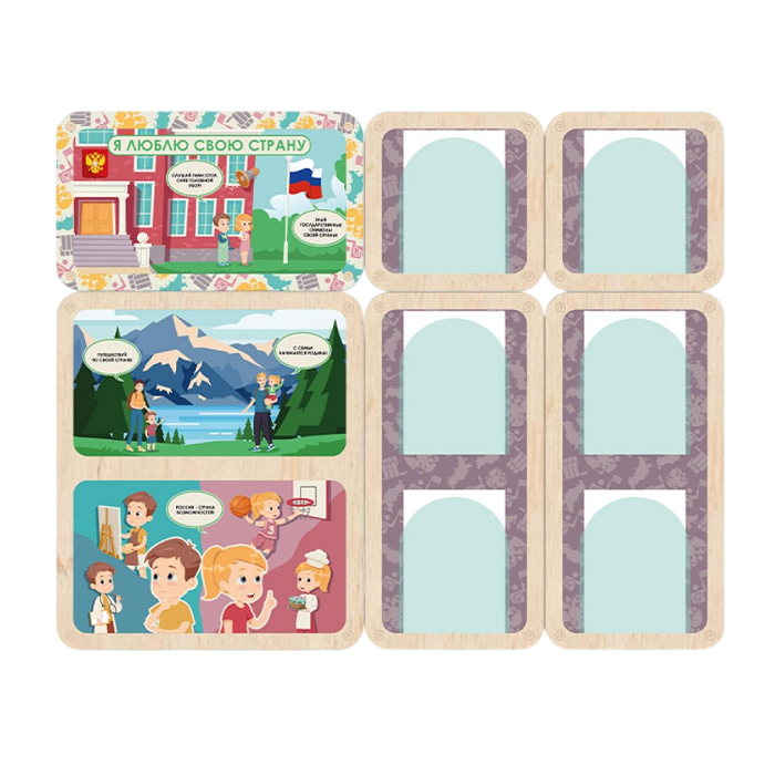 Информационный стенд для оформления стен в детских садах, начальной школе и организациях дополнительного образования. Красочные наглядные иллюстрации с простыми подписями помогут воспитать дошколятам правильные устои и ценности уважения к своей Родине, даже если они ещё не умеют читать. Важная информация для родителей может размещаться в акриловых карманах около каждого стенда.