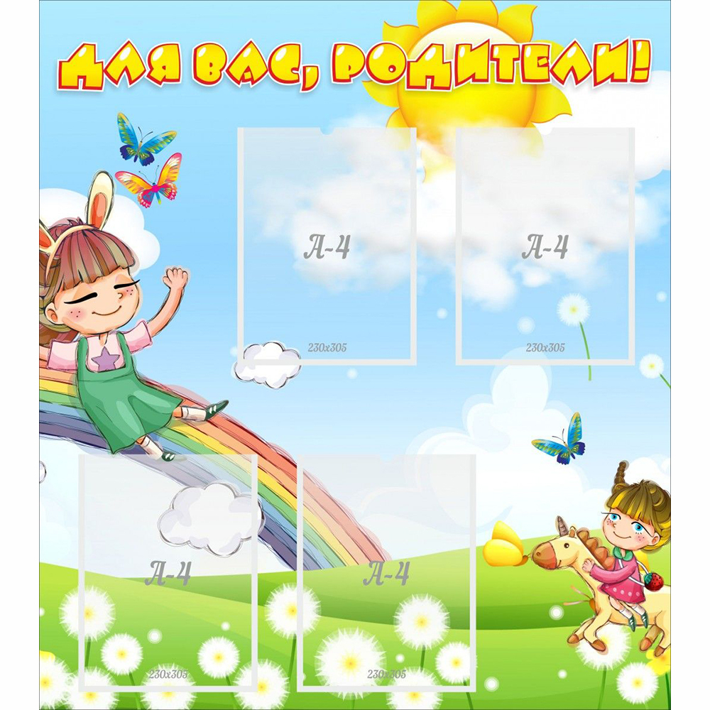 Яркий стенд станет прекрасным украшением вашего детского сада. На нем можно сразу разместить несколько объявлений, новых правил, в общем, любую информацию, которая будет актуальна для каждого родителя. А привлекательный внешний вид делает стенд более интересным в дизайнерском отношении.