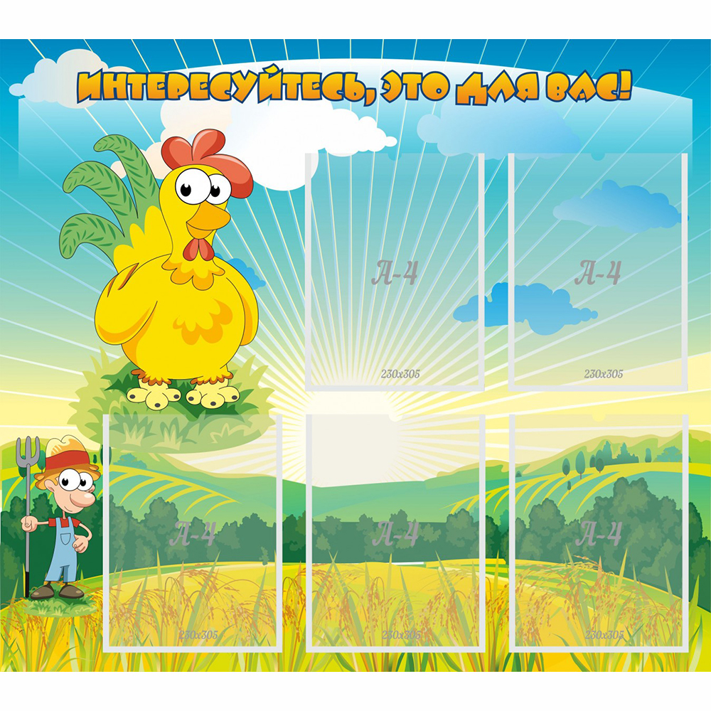 Желтый яркий петушок привлечет внимание не только детей, но и родителей. Фоном у стенда является тематическая картинка, на которой изображен фермер. Карманы для значимой информации не перекрывают важные элементы в оформлении стенда. Материал можно представить разнообразный. Это может быть расписание дополнительных кружков, график проведения детский утренников, тематических праздников. Информацию можно менять по мере необходимости. При желании подать материал оригинальным образом, можно использовать цветную печать, вставлять картинки, использовать в качестве фона цветную бумагу.
