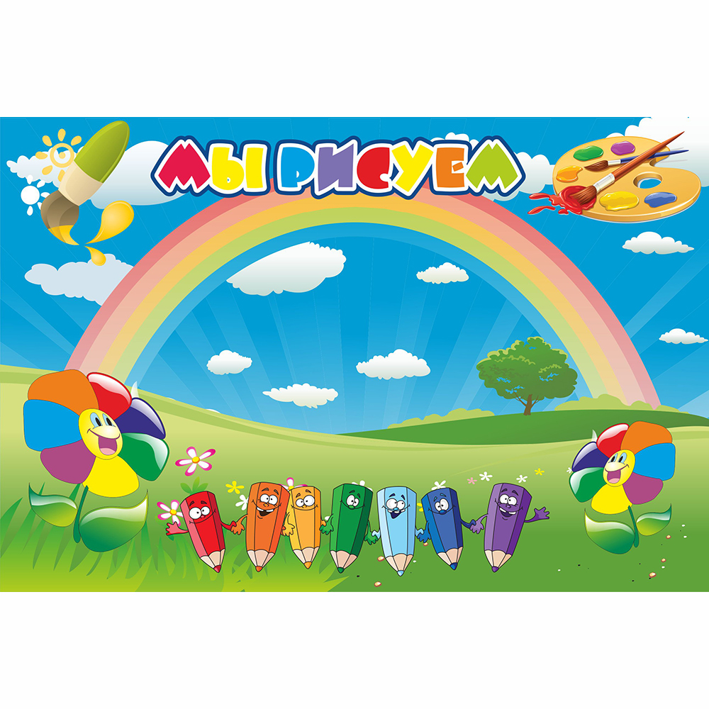 Магнитный стенд для рисунков является не только практичным инструментом, но и отличным средством для развития творческого потенциала детей. Этот вариант стенда "Мы рисуем" представляет сразу пара Цветиков-семицветиков. Яркая радуга и легкие плывущие облака в залитом солнечными лучами небе, развесёлая компания карандашей всех цветов радуги на лужайке, а также разноцветные буквы названия стенда создают радостное творческое настроения детям, а удобное крепление на магниты позволит без проблем разместить рисунки в любом месте стенда.