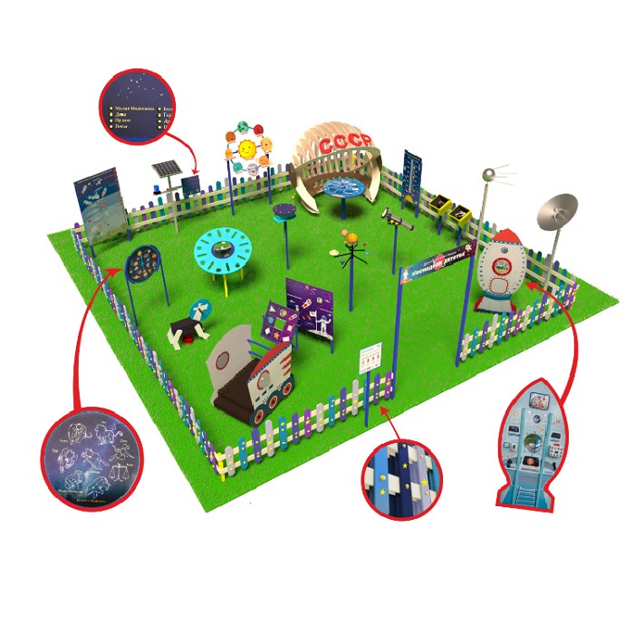 «Детская космическая станция» - это уличный комплекс, в состав которого входят красочные интерактивные стенды и макеты. С их помощью дети осваивают первые азы астрономии.
