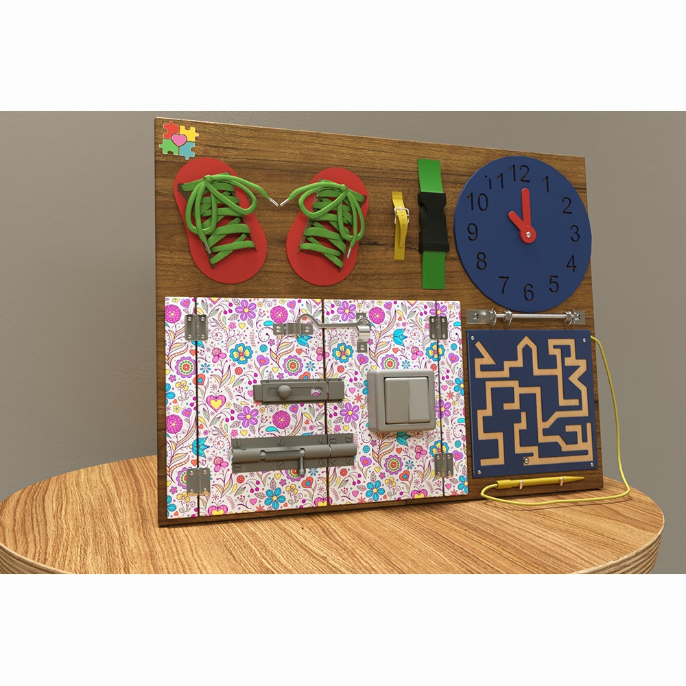 Передвигая одновременно обеими руками разнообразные элементы в магнитном лабиринте, ребёнок в доступной игровой форме развивает работу обоих полушарий головного мозга, а открывание и закрывание дверных запоров, одёжных замочков и дверок - стимулирует мелкую моторику пальцев. Циферблат поможет понять, что такое время.